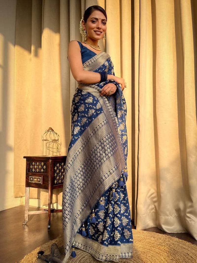 Blue soft silk blend banarasi jacuard work designer saree with blouse