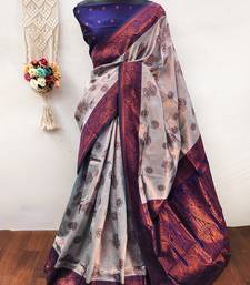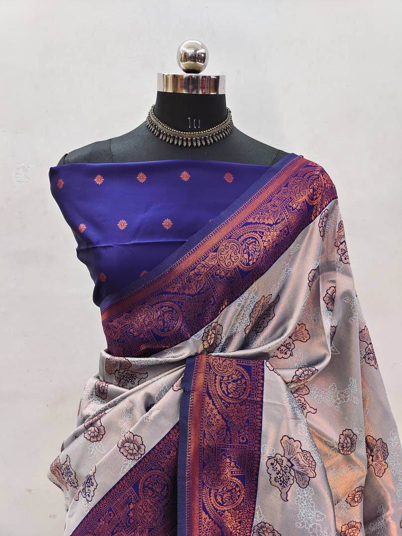 Grey neavy blue soft silk blend banarasi jacuard work designer party wear saree with unstitched blouse piece