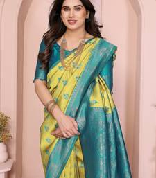 Lemon rama soft art silk blend banarasi jacuard work designer party wear saree with unstitched blouse piece