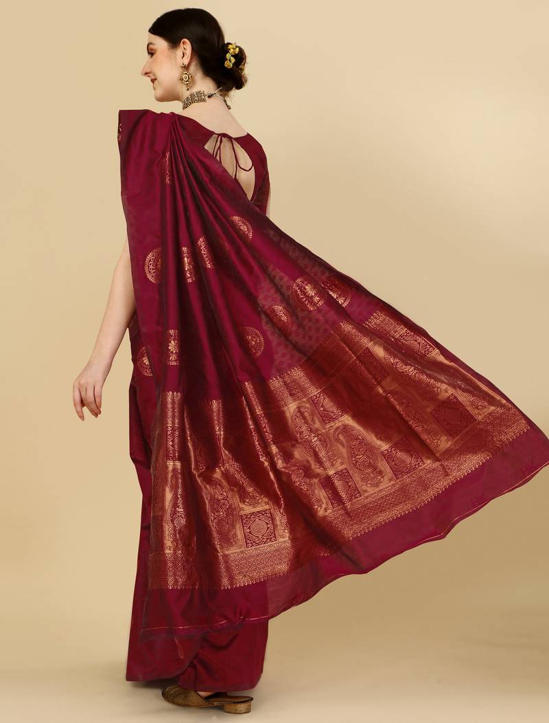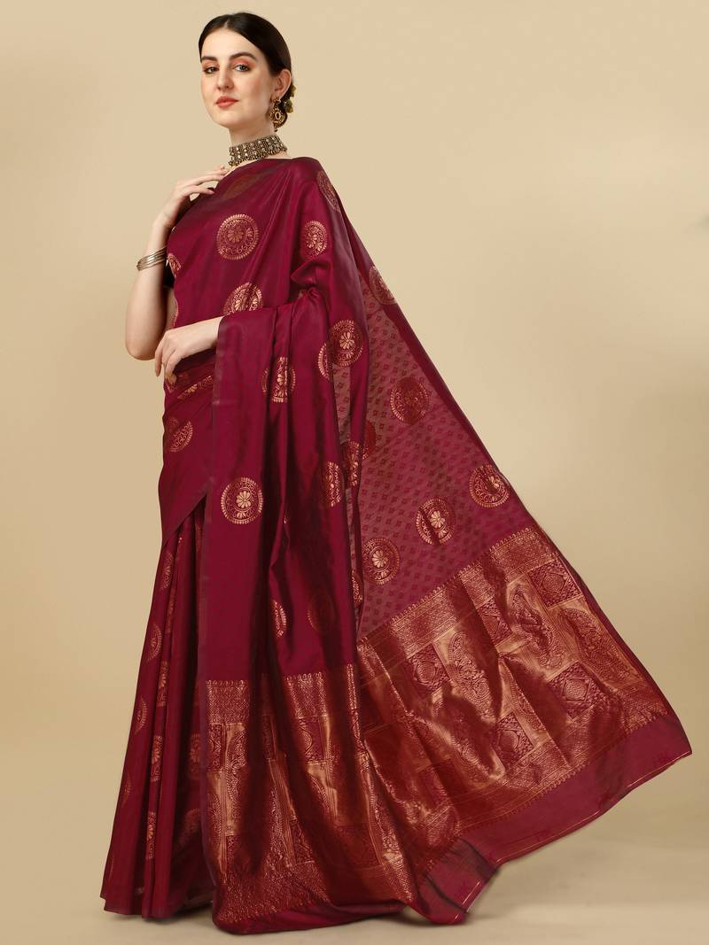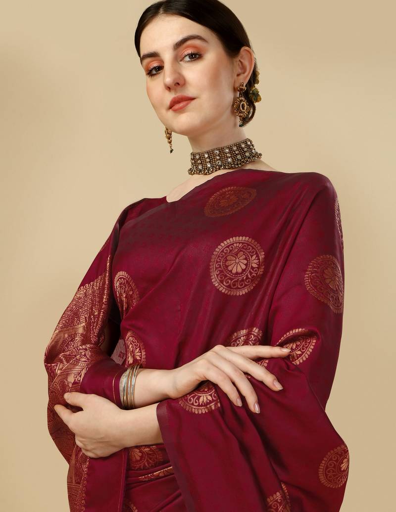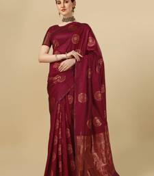 Maroon soft silk blend banarasi jacuard work designer party wear saree with unstitched blouse piece