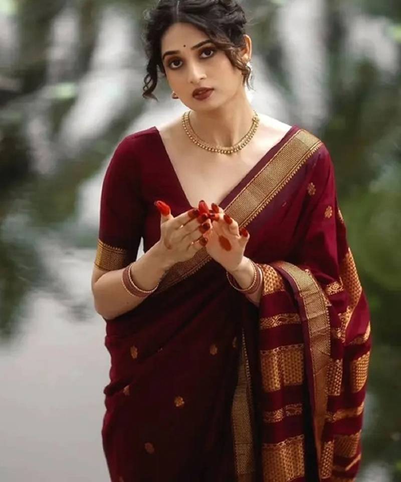 Maroon soft silk blend banarasi jacuard work designer party wear saree with unstitched blouse piece