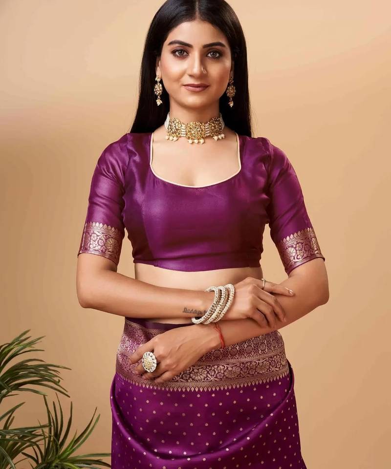 Product Name Purple Soft Silk Blend Banarasi Jacuard Work Designer Party Wear Saree With Unstitched Blouse Piece