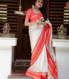 White red soft art silk banarasi jacuard work designer party wear saree with unstitched blouse piece