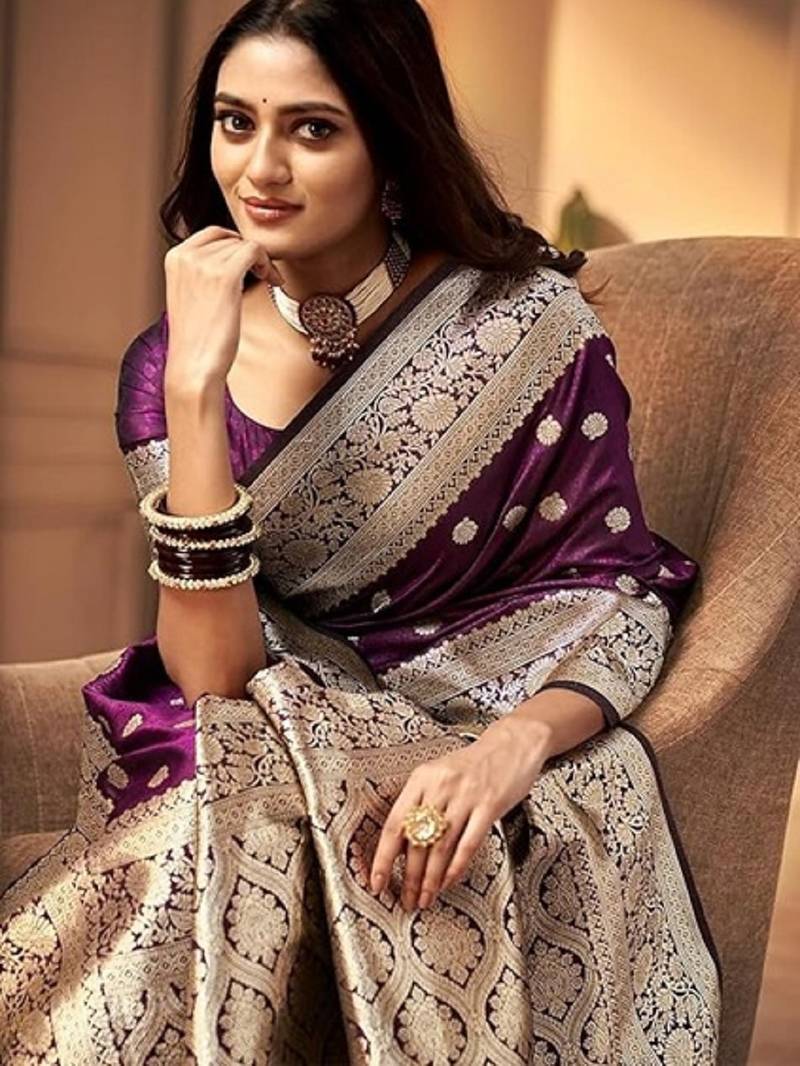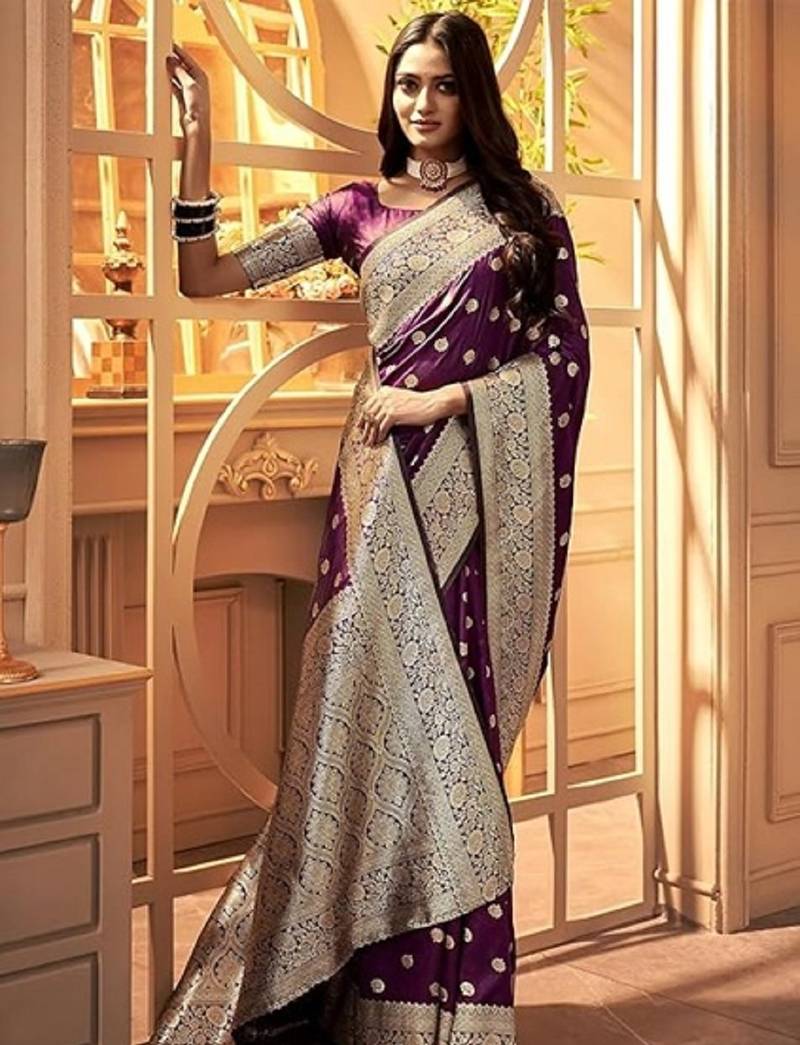 Wine soft silk blend banarasi jacuard work designer party wear saree with unstitched blouse piece