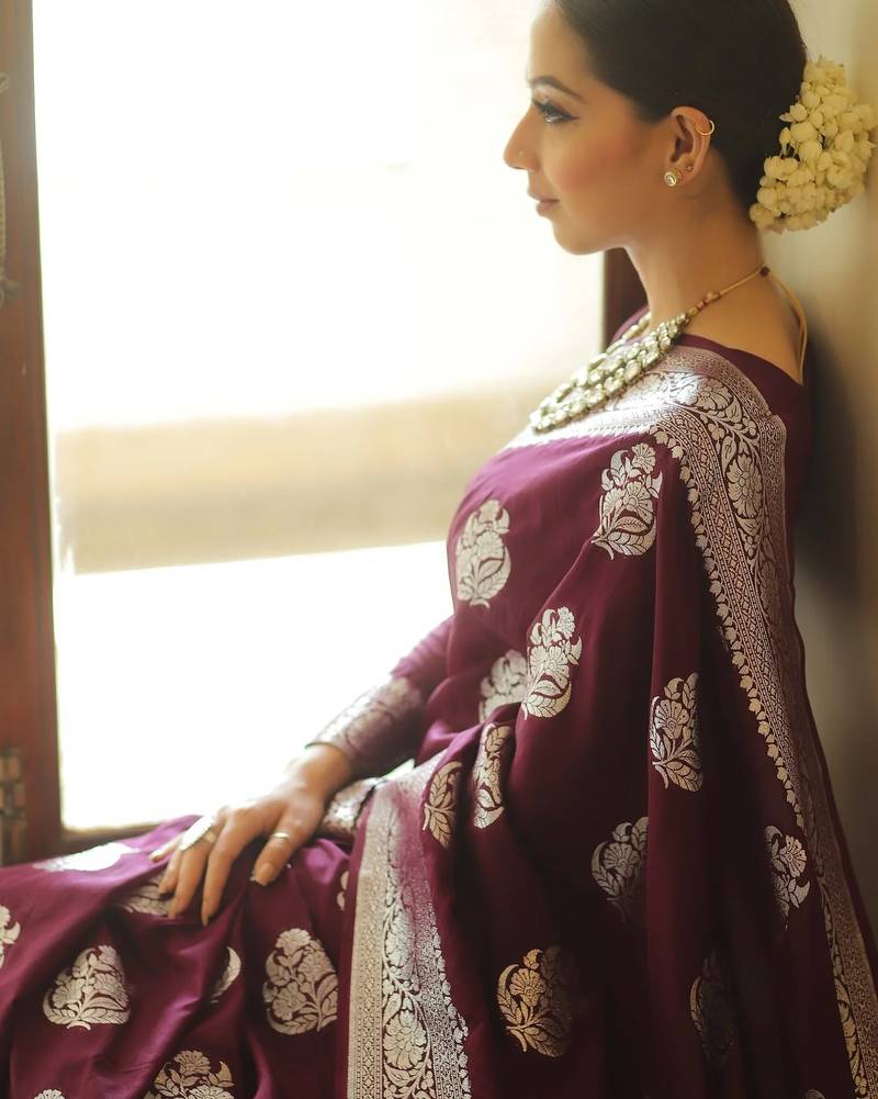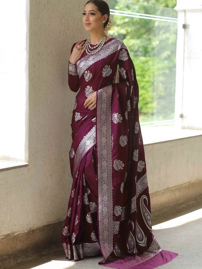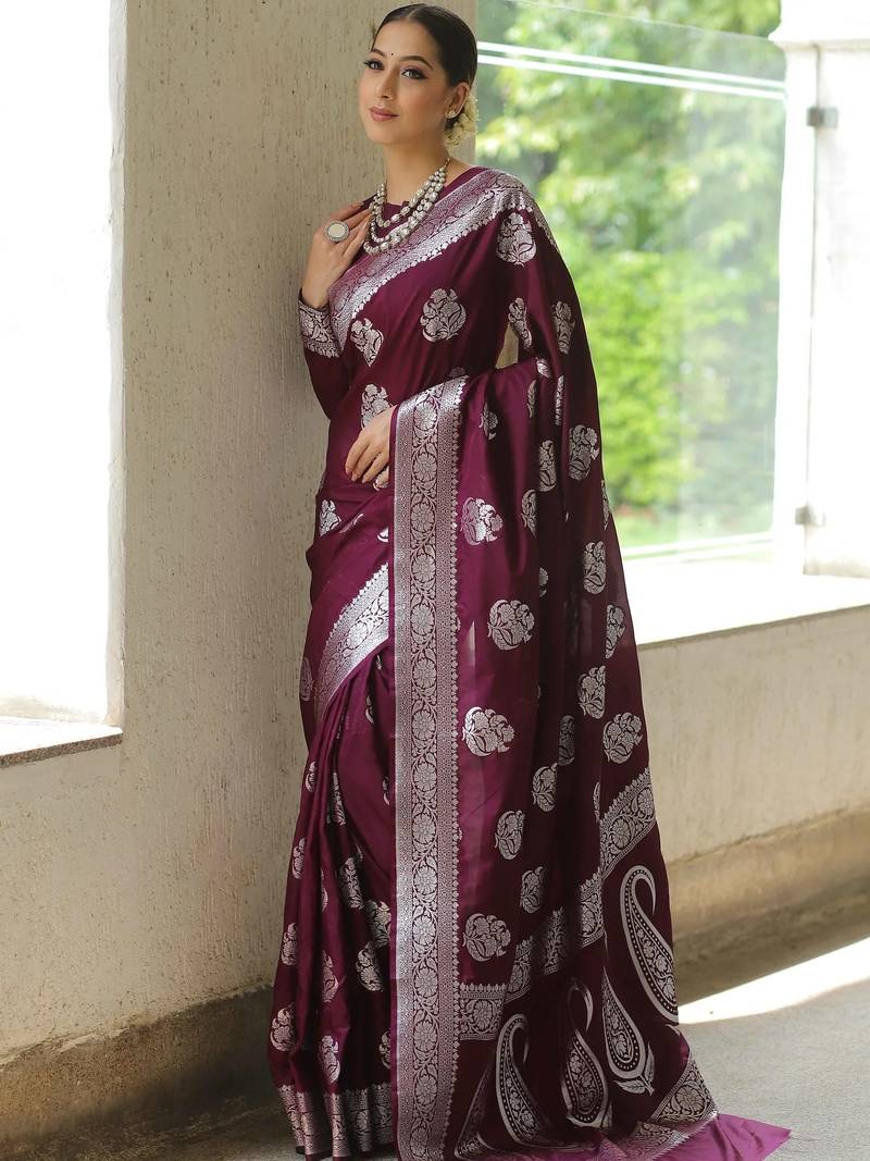 | Product Name | Wine Soft Silk Blend Banarasi Jacuard Work Designer Party Wear Saree With Unstitched Blouse Piece | |