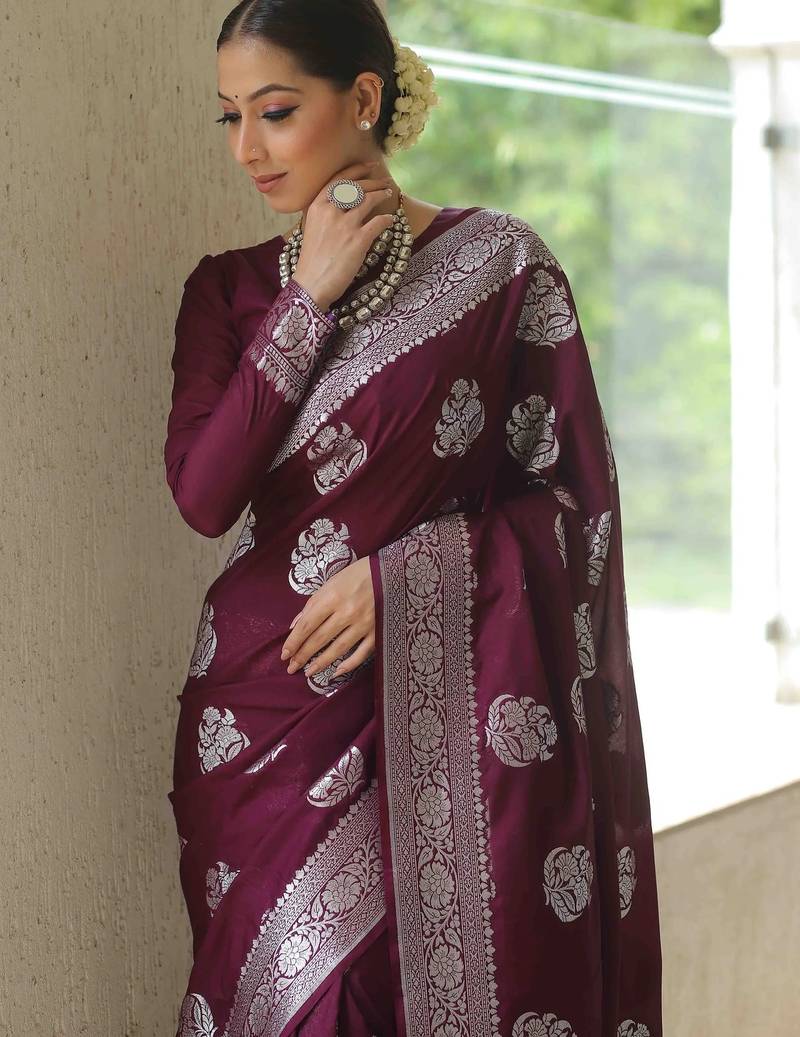 Wine soft silk blend banarasi jacuard work designer party wear saree with unstitched blouse piece