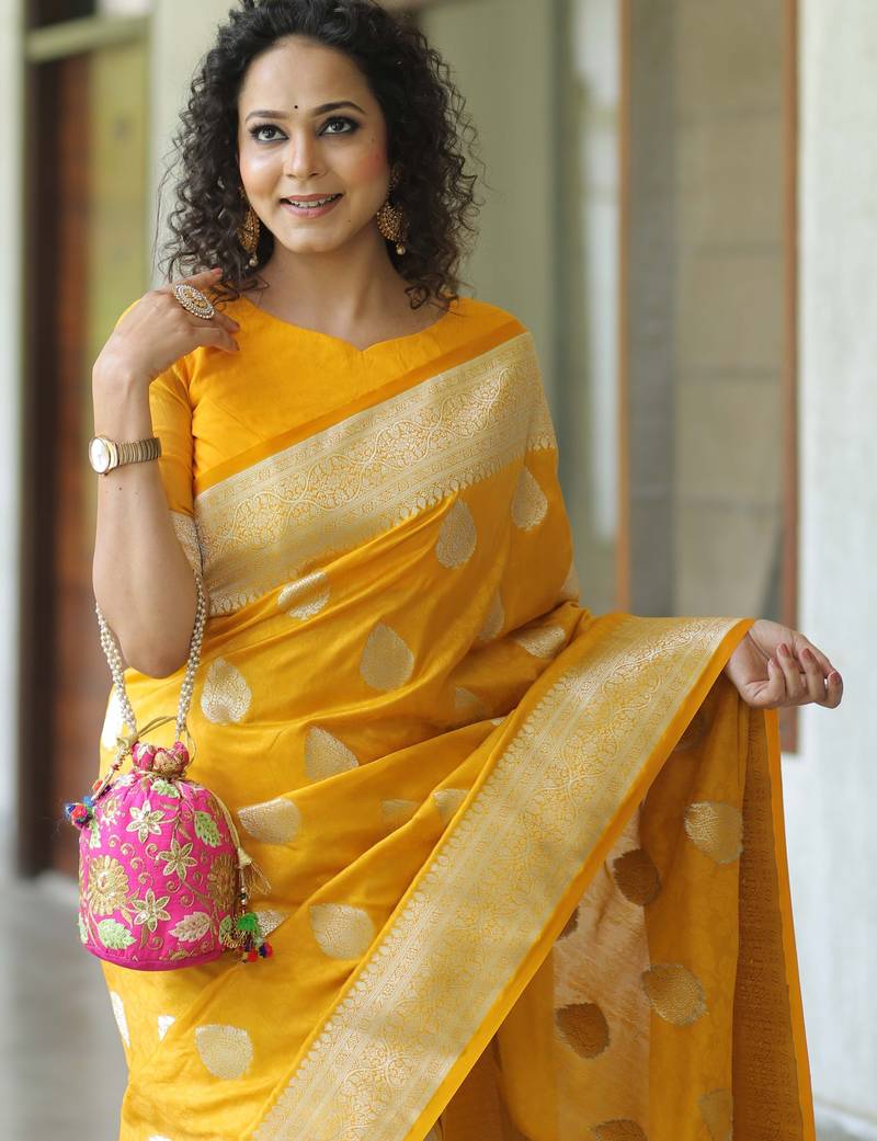 Yellow soft silk blend banarasi jacuard work designer party wear saree with unstitched blouse piece