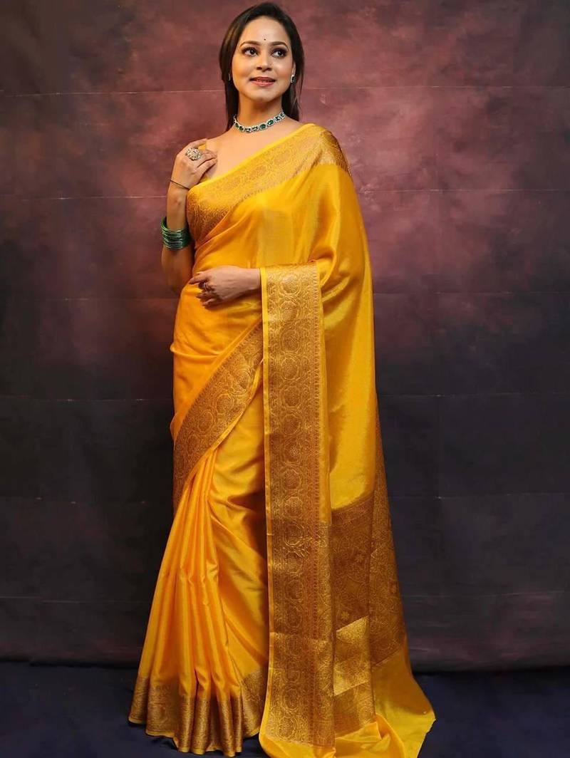 Product Name Yellow Soft Silk Blend Banarasi Jacuard Work Designer Saree With Blouse