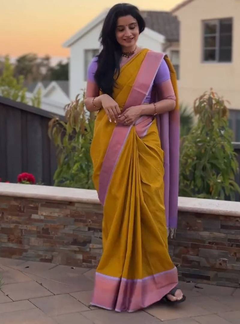 Yellow soft silk blend banarasi jacuard work designer saree with blouse