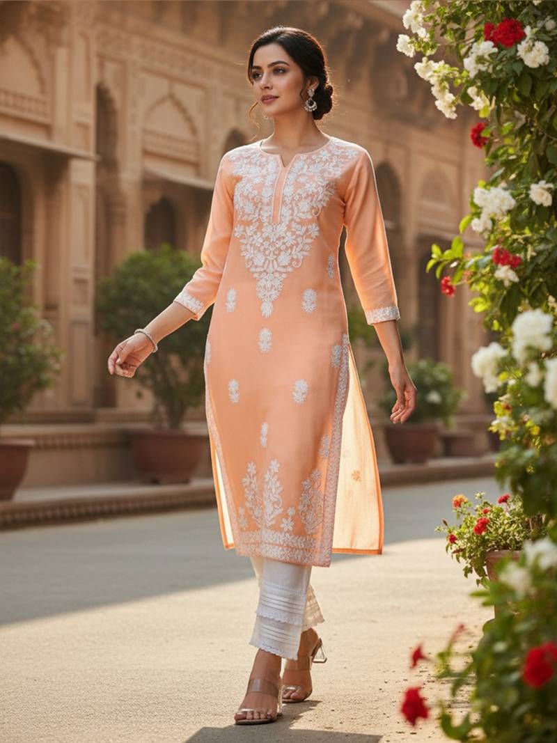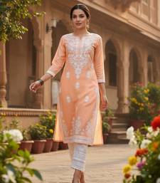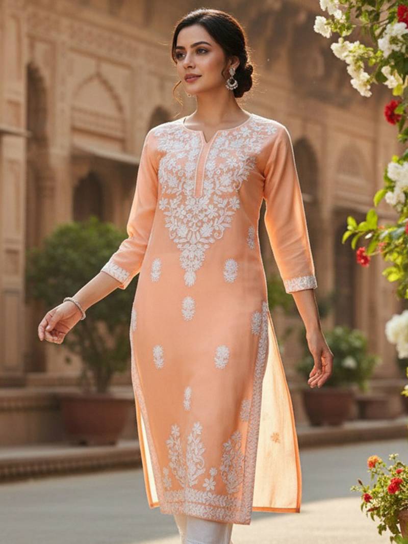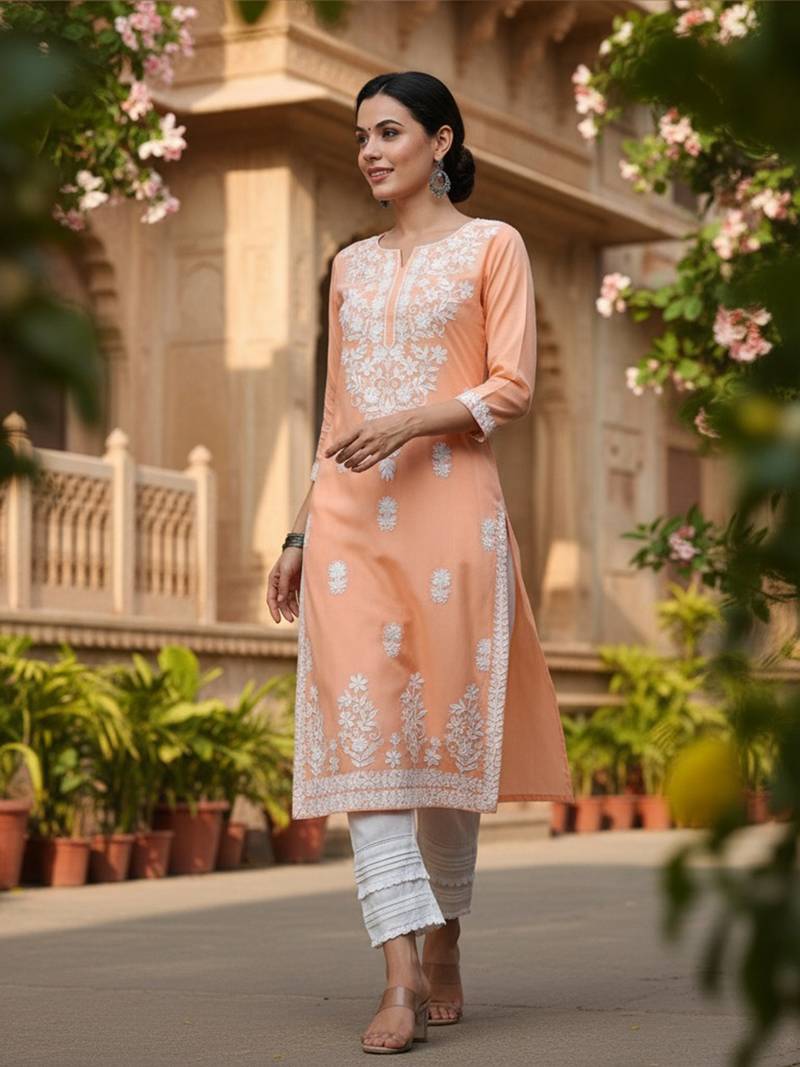 | Product Name | Women Peach Viscose Rayon Solid Embroidered Chikankari Straight Kurta | |