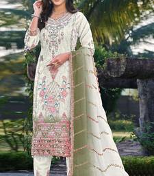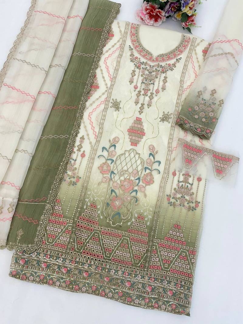 White & mehendi silk suit with embroidery & sequin work semi stitched