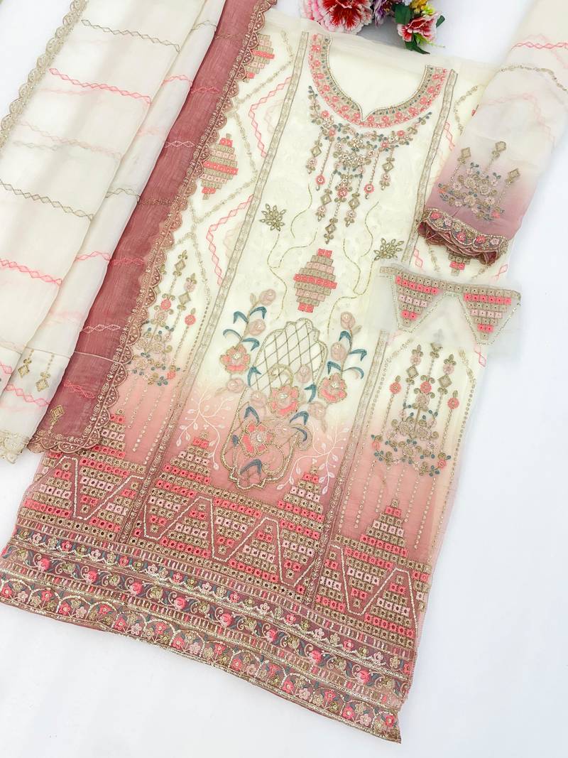 White & peach silk suit with embroidery & sequin work semi stitched