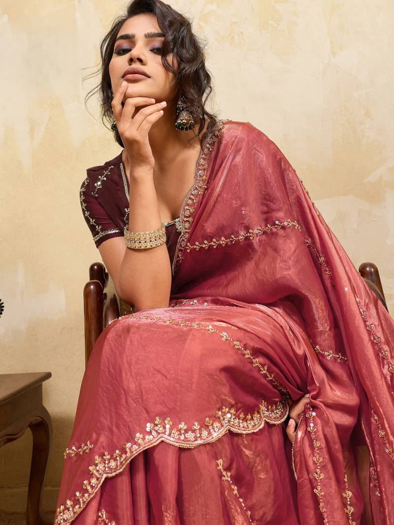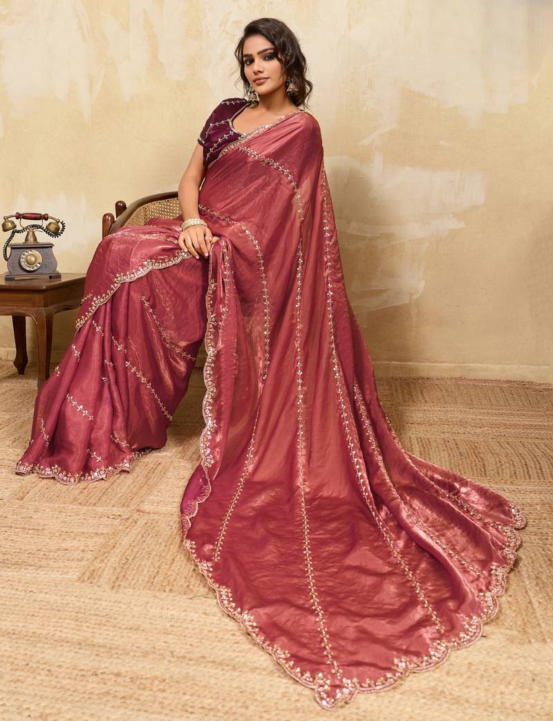 | Product Name | Baby Pink Designer Metallic Velvet Satin Saree With Cutdana & Sequin Zari Work | |