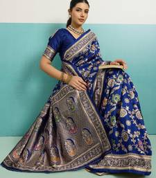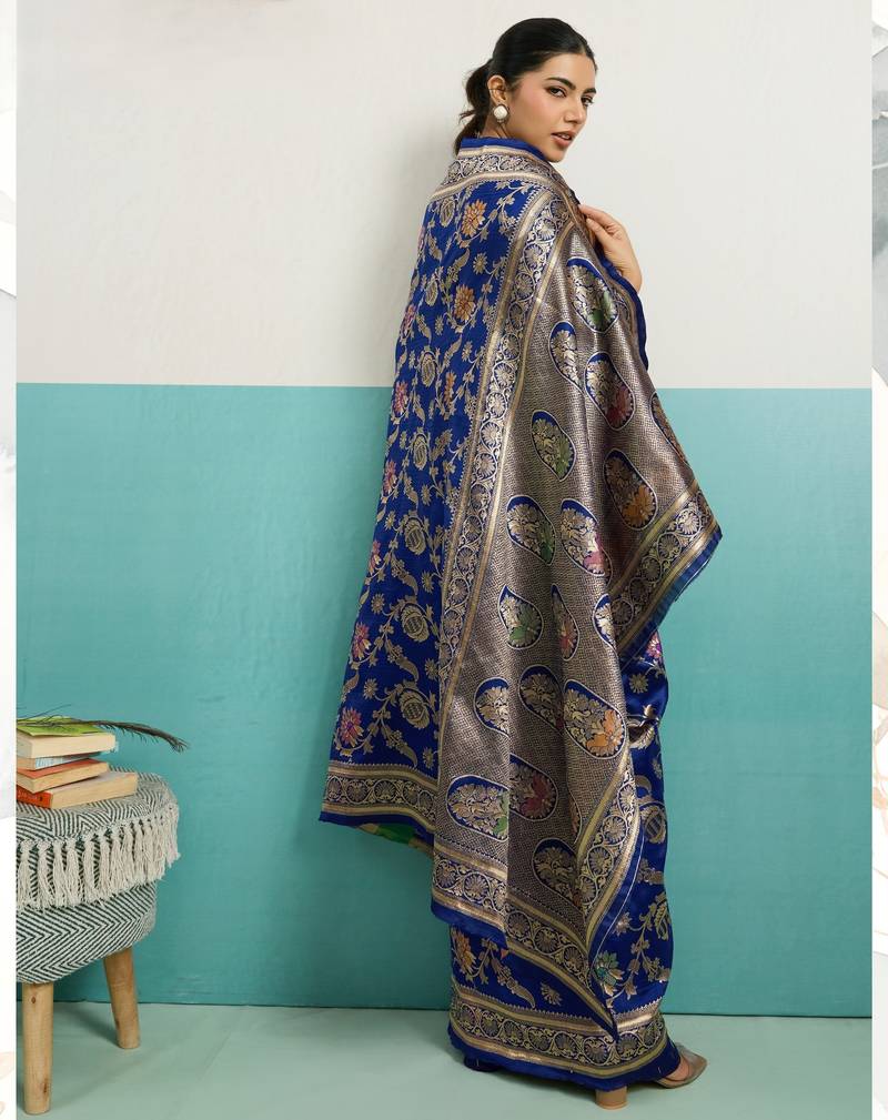 Blue soft banarasi silk saree with meenakari floral jaal weaving