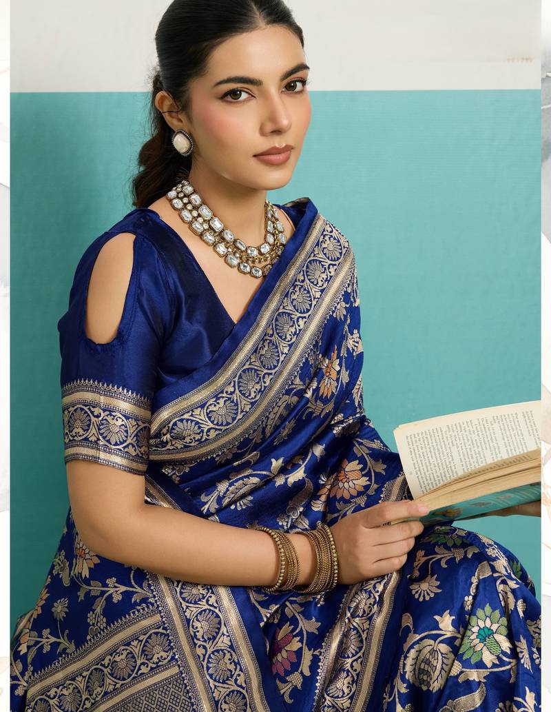 | Product Name | Blue Soft Banarasi Silk Saree With Meenakari Floral Jaal Weaving | |