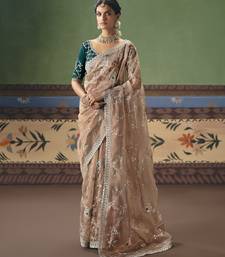 Chiku elegant fancy saree with designer embroidery, sequins, stones & pearl work with matching blouse