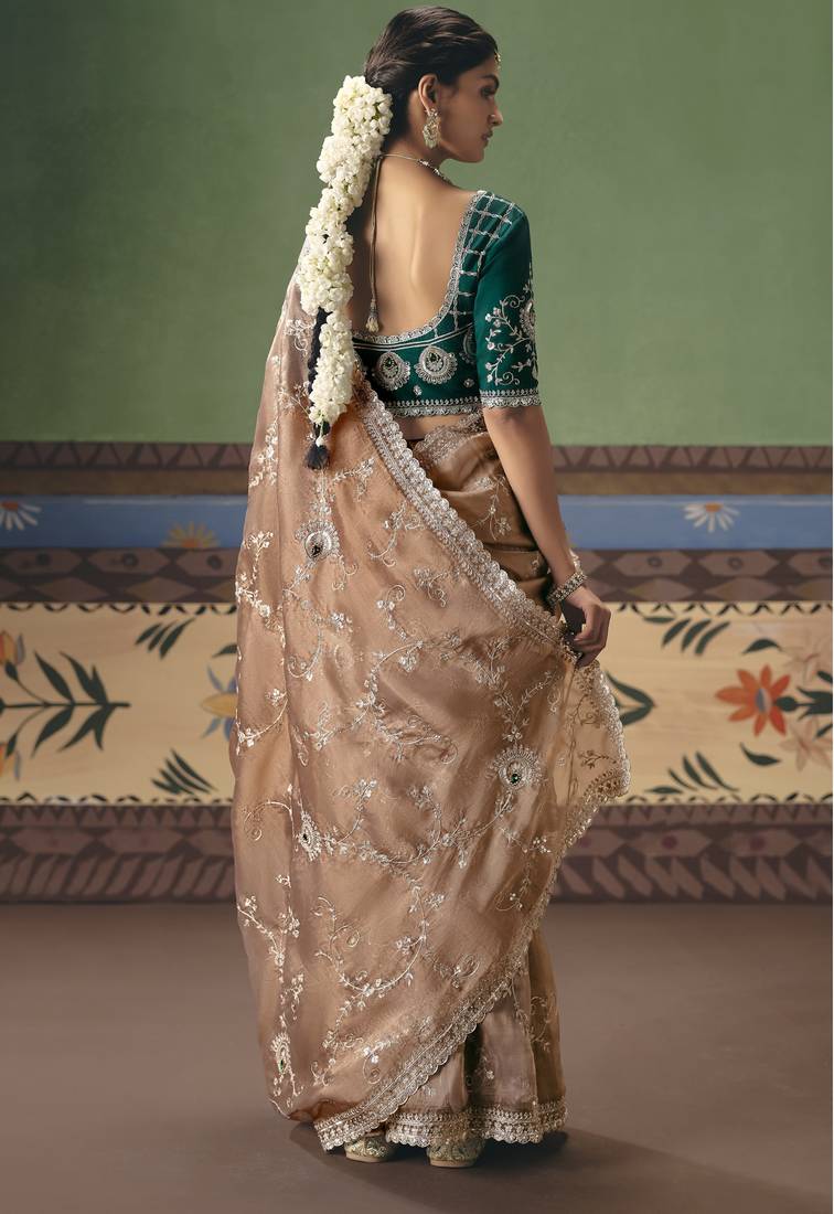 Product Name Chiku Elegant Fancy Saree With Designer Embroidery, Sequins, Stones & Pearl Work With Matching Blouse