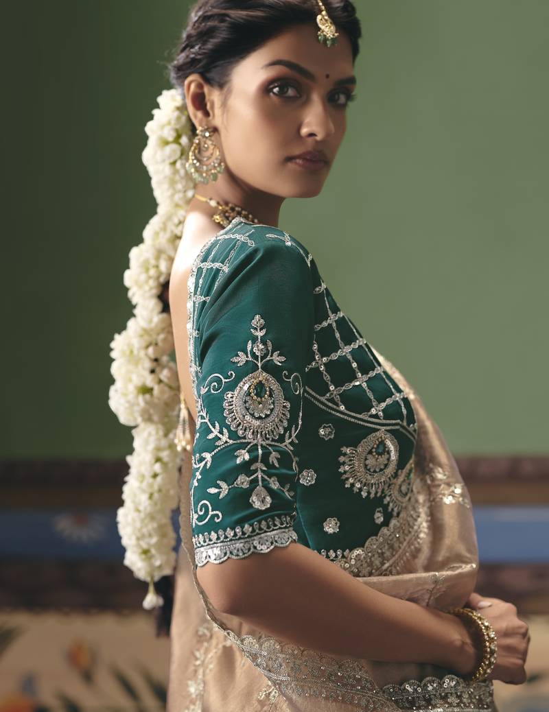chiku elegant fancy saree with designer embroidery, sequins, stones & pearl work with matching blouse