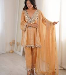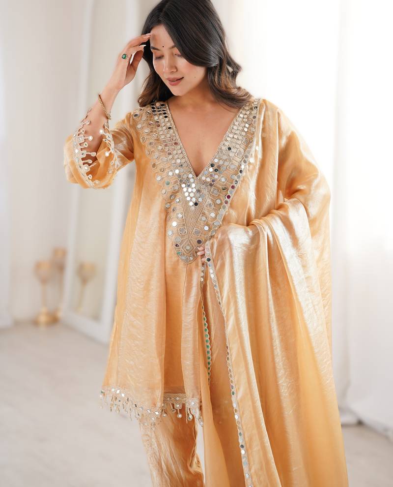 Chiku women’s fendy fabric mirror work kurti set with pant & dupatta