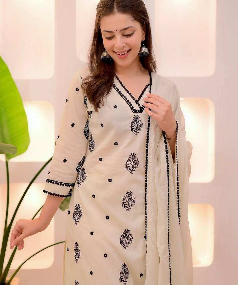 Cream women georgette embroidered kurti pant with lace dupatta set | stylish ethnic suit set stitched
