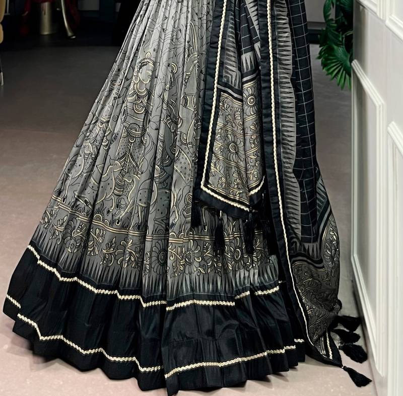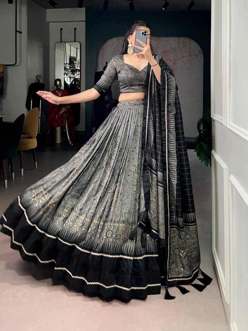 | Product Name | Grey Tasar Silk Lehenga Set With Kalamkari Print & Lace Border Includes Blouse & Tassel Dupatta | |