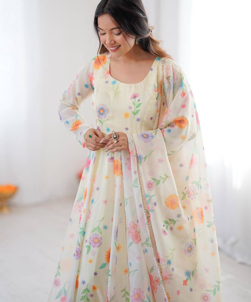 | Product Name | Off White Floral Organza Gown Set With Micro Cotton Inner & Dupatta | |