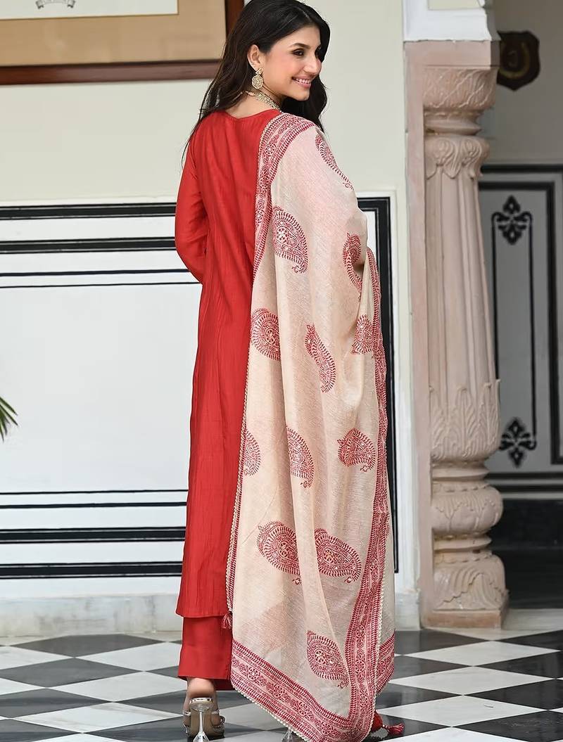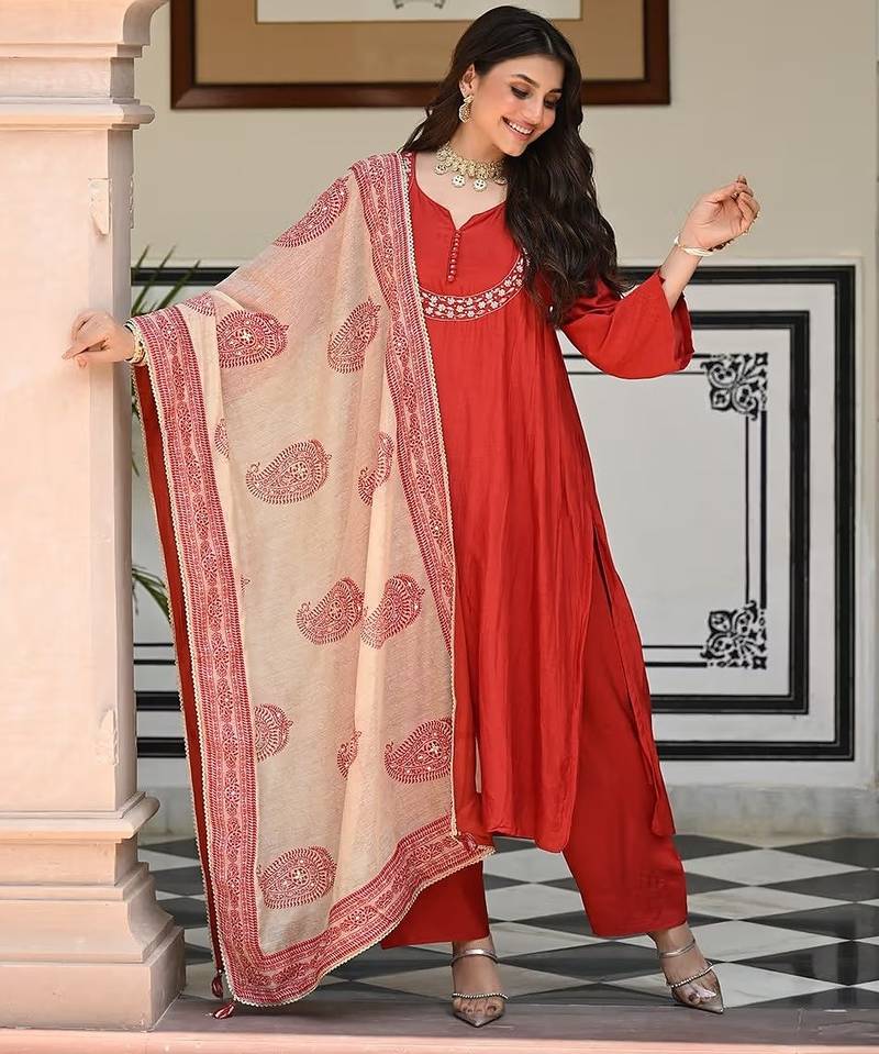 | Product Name | Orange Women Viscose Embroidered Kurta With Viscose Bottom And Chanderi Print Dupatta Set | |