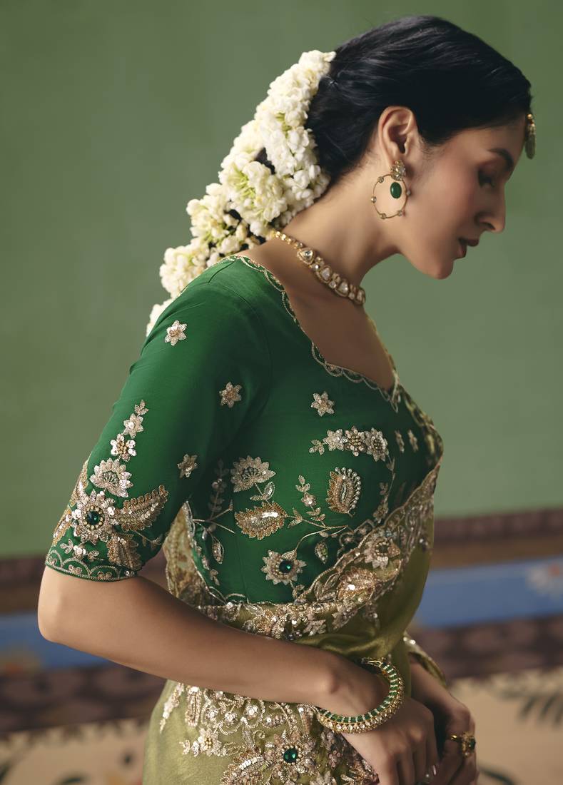 Parrot green elegant fancy saree with designer embroidery, sequins, stones & pearl work with matching blouse