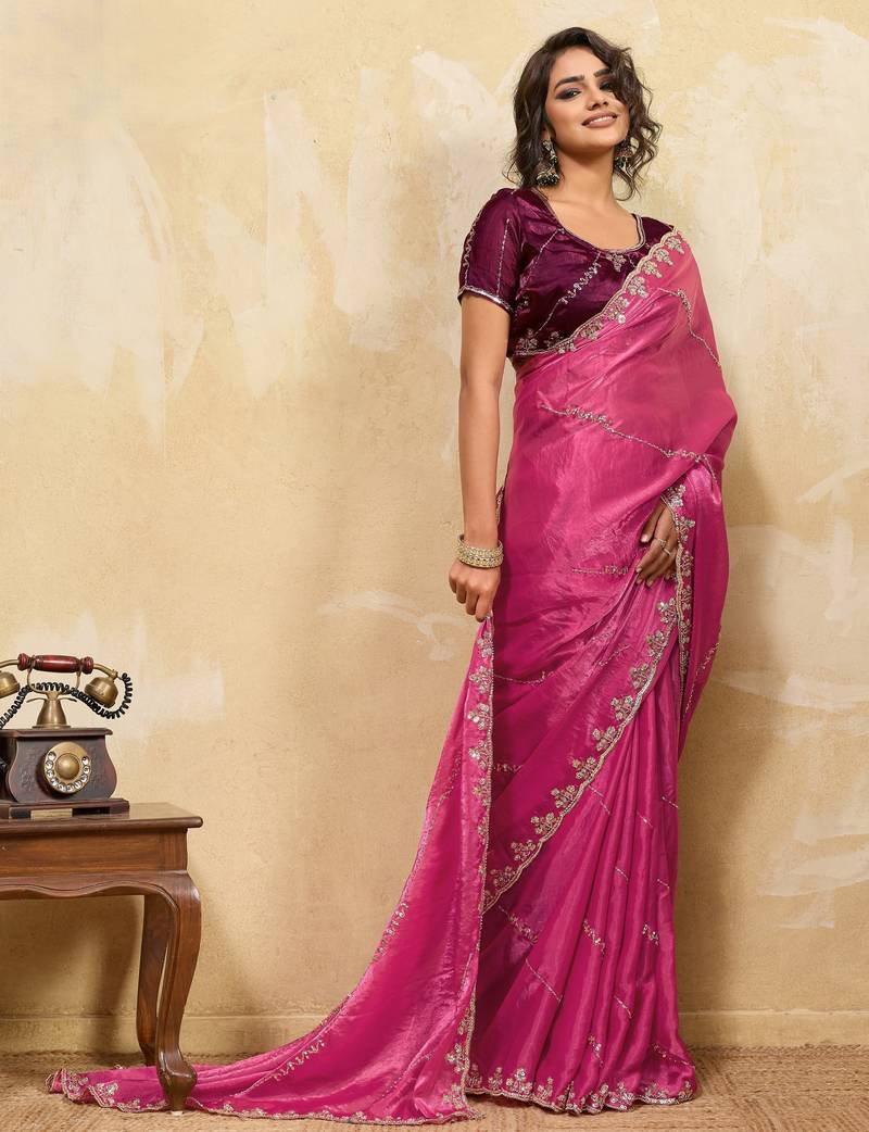 Pink designer metallic velvet satin saree with cutdana & sequin zari work