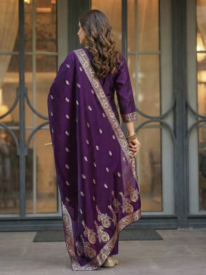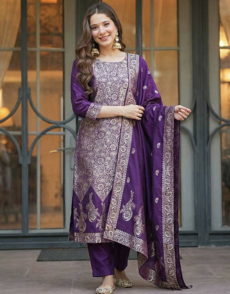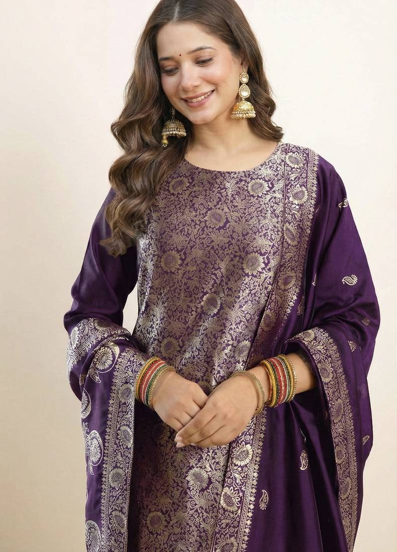 | Product Name | Purple Art Silk Jacquard Salwar Suit Set With Round Neck & Matching Dupatta | |
