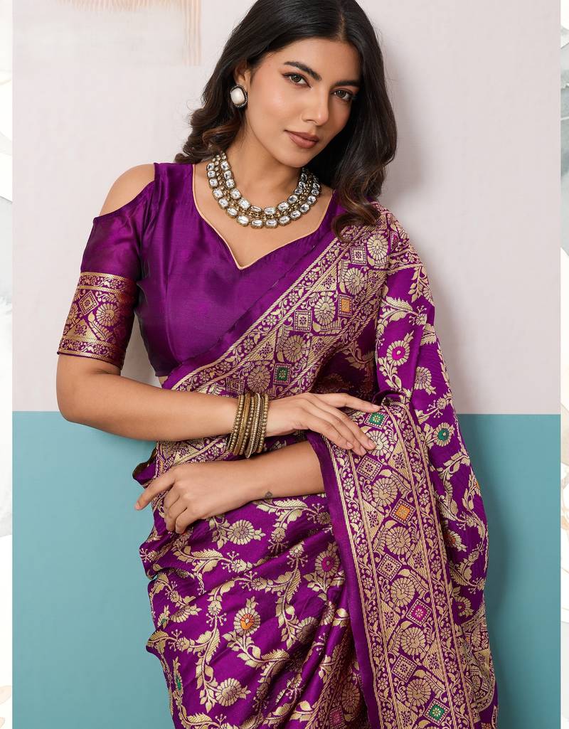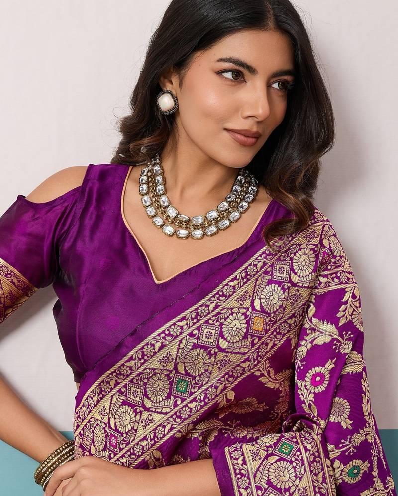 | Product Name | Purple Soft Banarasi Silk Saree With Meenakari Floral Jaal Weaving | |