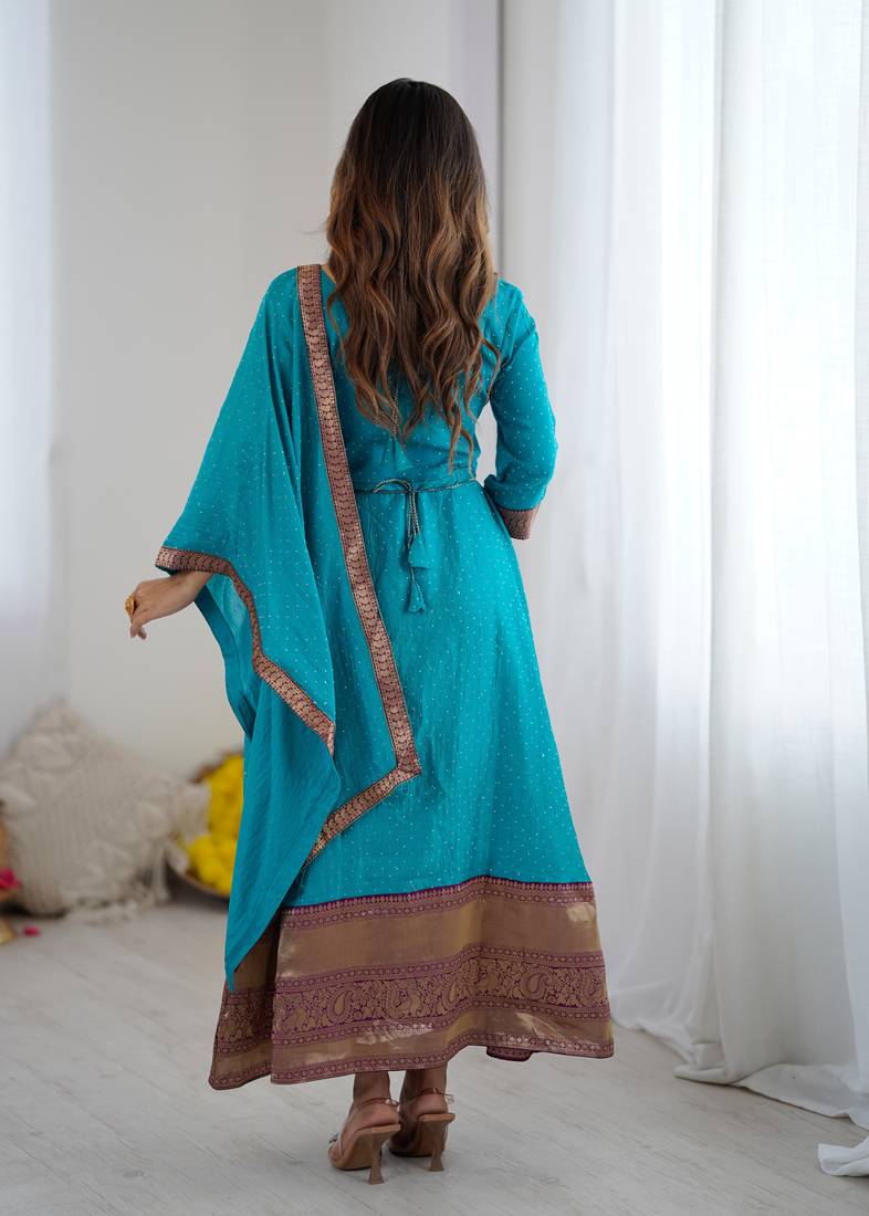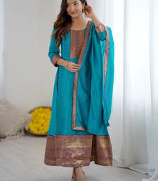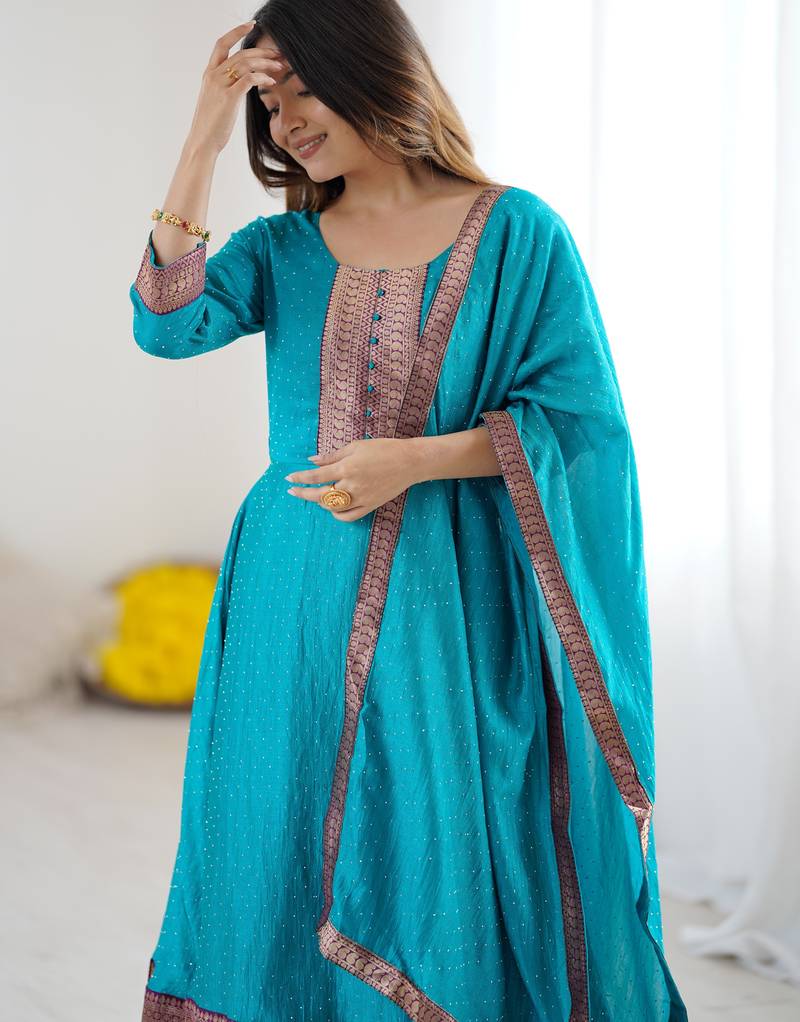 Product Name Sky Blue Women Elegant Blooming Vichitra Gown With Jacquard Lace Border Dupatta | Party Wear Ethnic Gown |