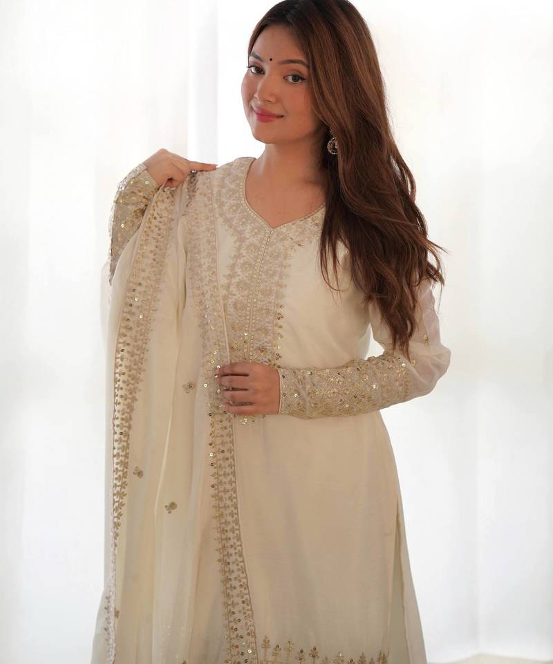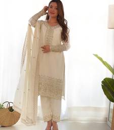 White women pure chinon silk embroidered kurta with heavy silk pant and embroidered dupatta set – ready to wear stitched