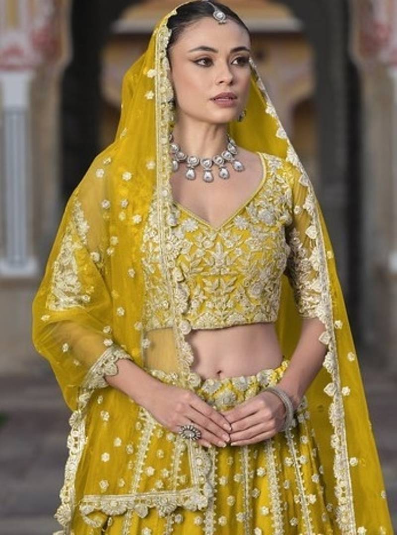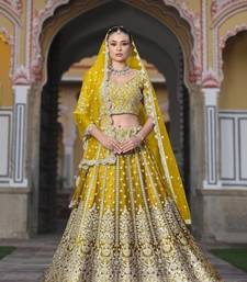 Yellow pure butterfly net embroidered lehenga choli with dupatta sequins & diamond work bridal wedding