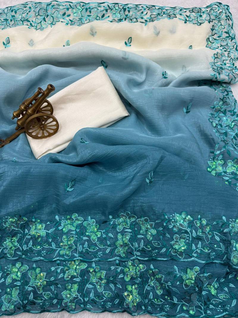 Blue color embroidery work crunchy silk saree