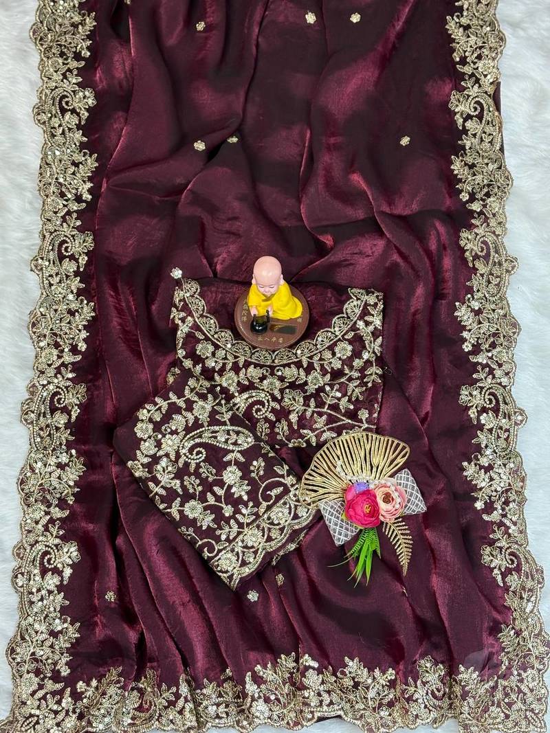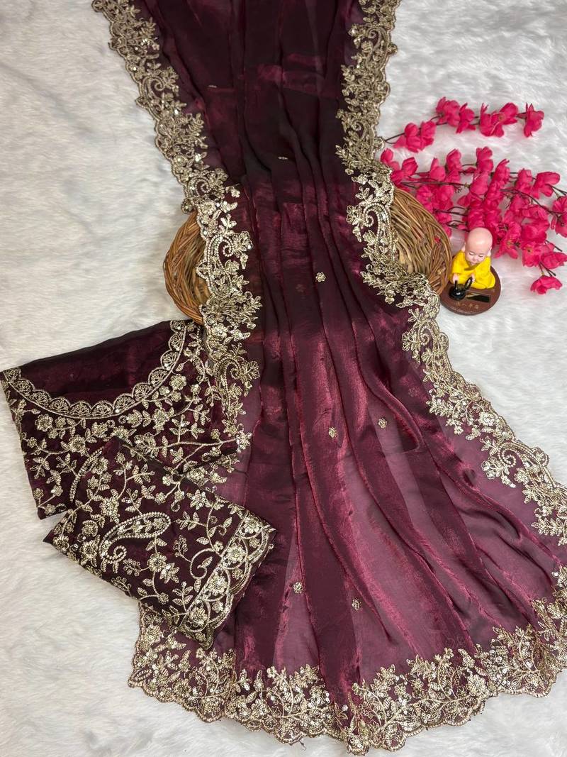 | Product Name | Plum Color Embroidery Work Fandy Satin Saree | |
