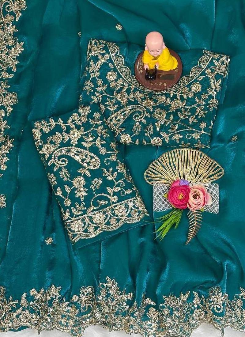 Teal color embroidery work fandy satin saree
