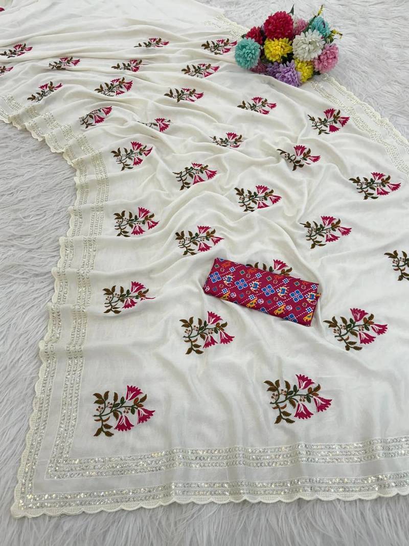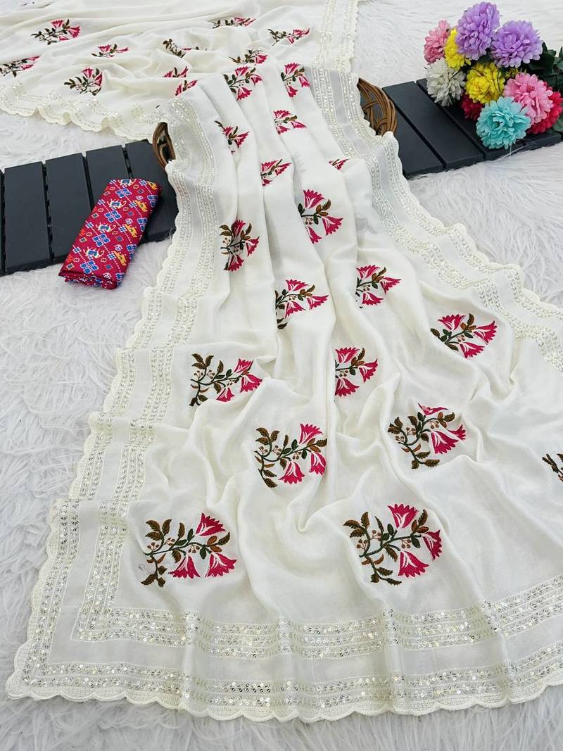 | Product Name | White Color Embroidery Work And Multi Thread Work With Cut Work Border Vichitra Silk Saree | |