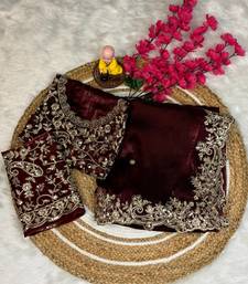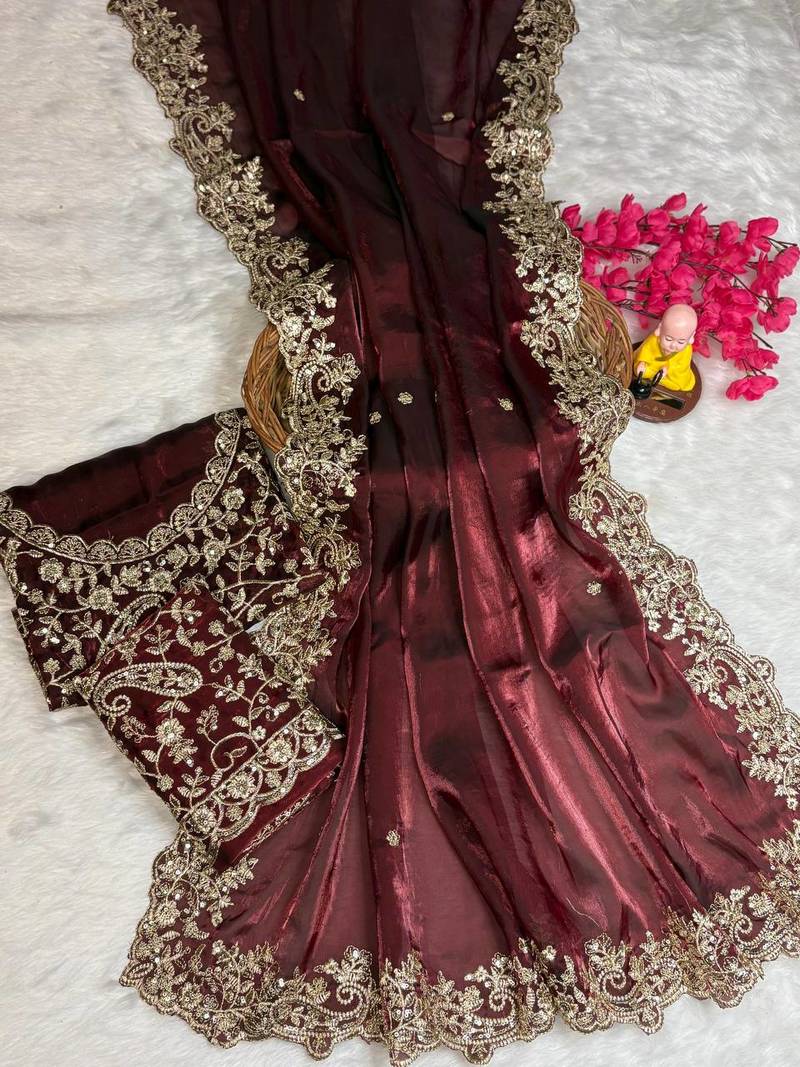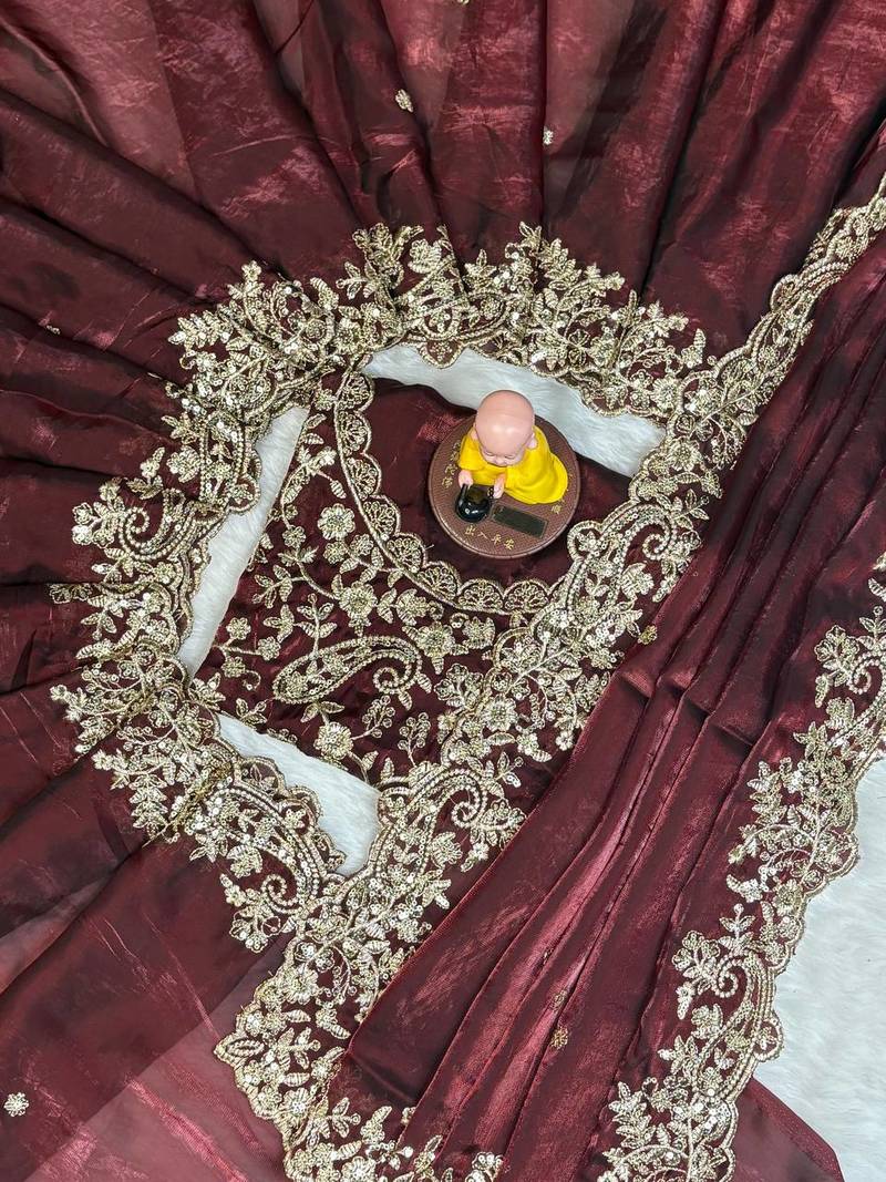 Wine color embroidery work fandy satin saree