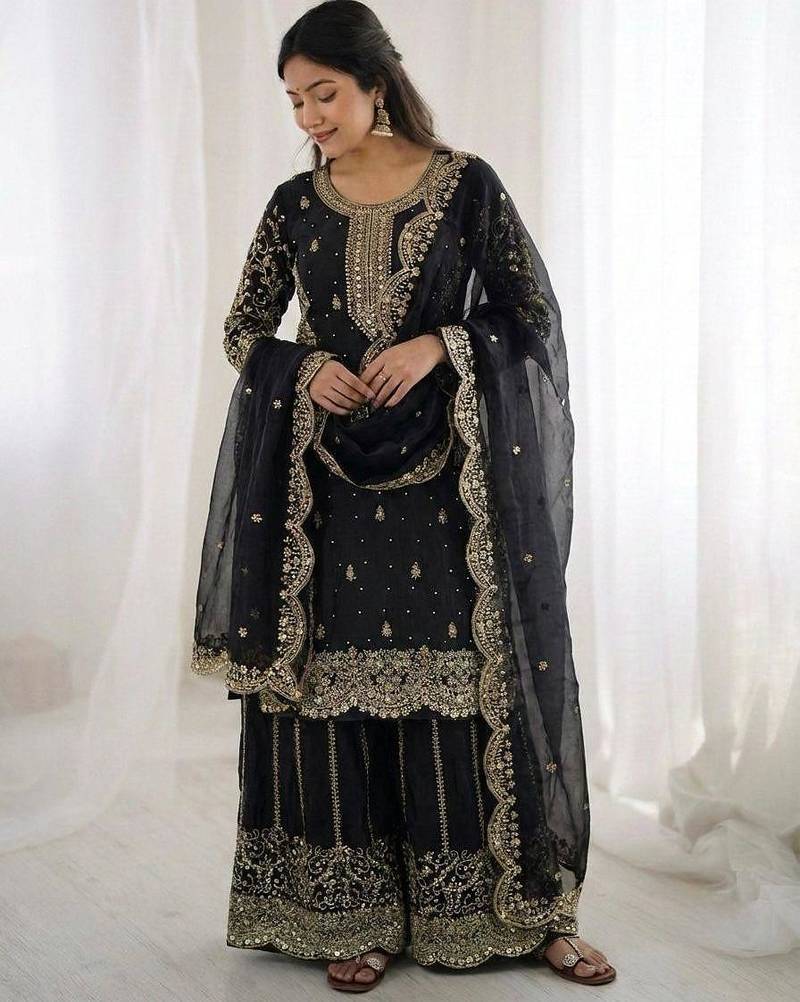 Elegant Black Sharara Suit Adorned With Delicate Gold Embroidery And Intricate Detailing. The Sophisticated Kurta Pairs With A Flared Sharara And Sheer Dupatta For A Glamorous Ethnic Look. Perfect For Evening Parties, Festive Events, And Wedding Celebrations. Premium Fabric And Refined Craftsmanship Create A Bold And Timeless Fashion Statement.