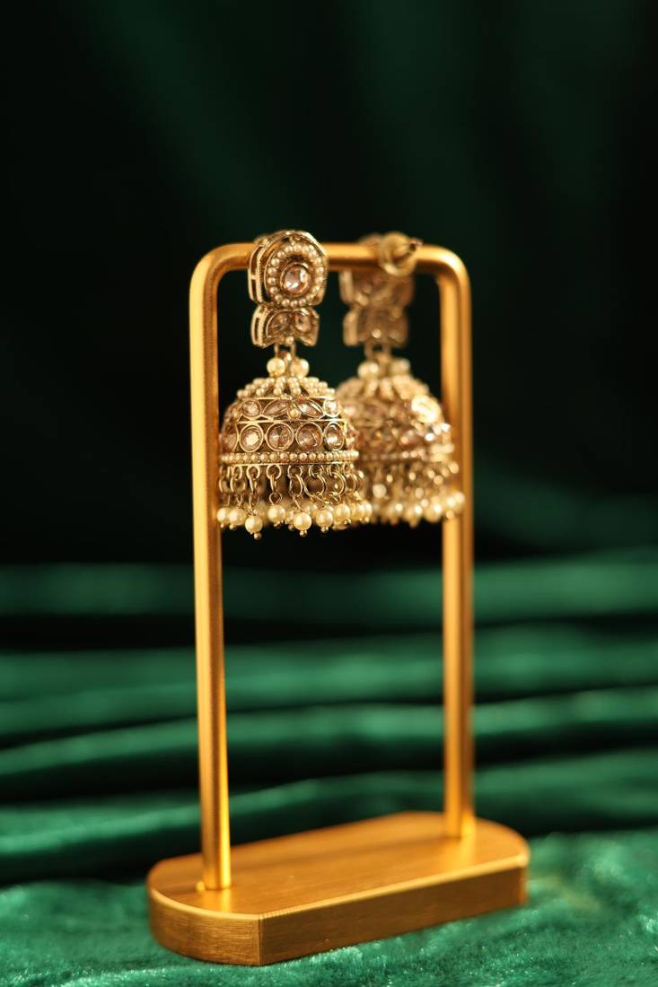 | Product Description | Celebrate Timeless Elegance With These Pearl Jhumka Earrings. Featuring Sparkling Crystal Stones, Antique Gold Tone Metalwork, And Layered Pearl Embellishments, This Traditional Design Delivers Graceful Movement And Shine. Ideal For Weddings, Festivals, Or Cultural Celebrations, These Earrings Complement Sarees, Salwar Suits, And Other Ethnic Outfits Effortlessly. |