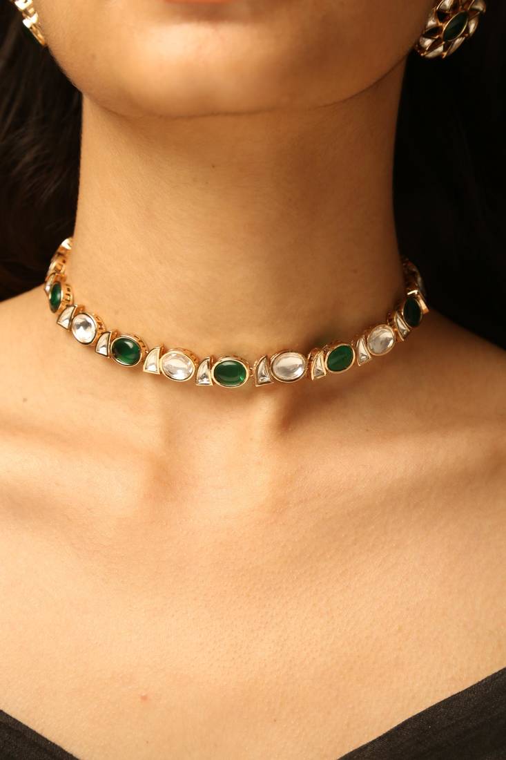 | Product Description | This Elegant Green Stone Necklace Set Features A Sleek Gold Tone Chain Adorned With Alternating Emerald Green And Clear Stones For A Modern Yet Classic Look. Designed For Effortless Elegance, The Matching Stud Earrings Add Balance And Charm. Ideal For Weddings, Parties, And Festive Celebrations, Offering Lightweight Comfort With Refined Traditional Style. |