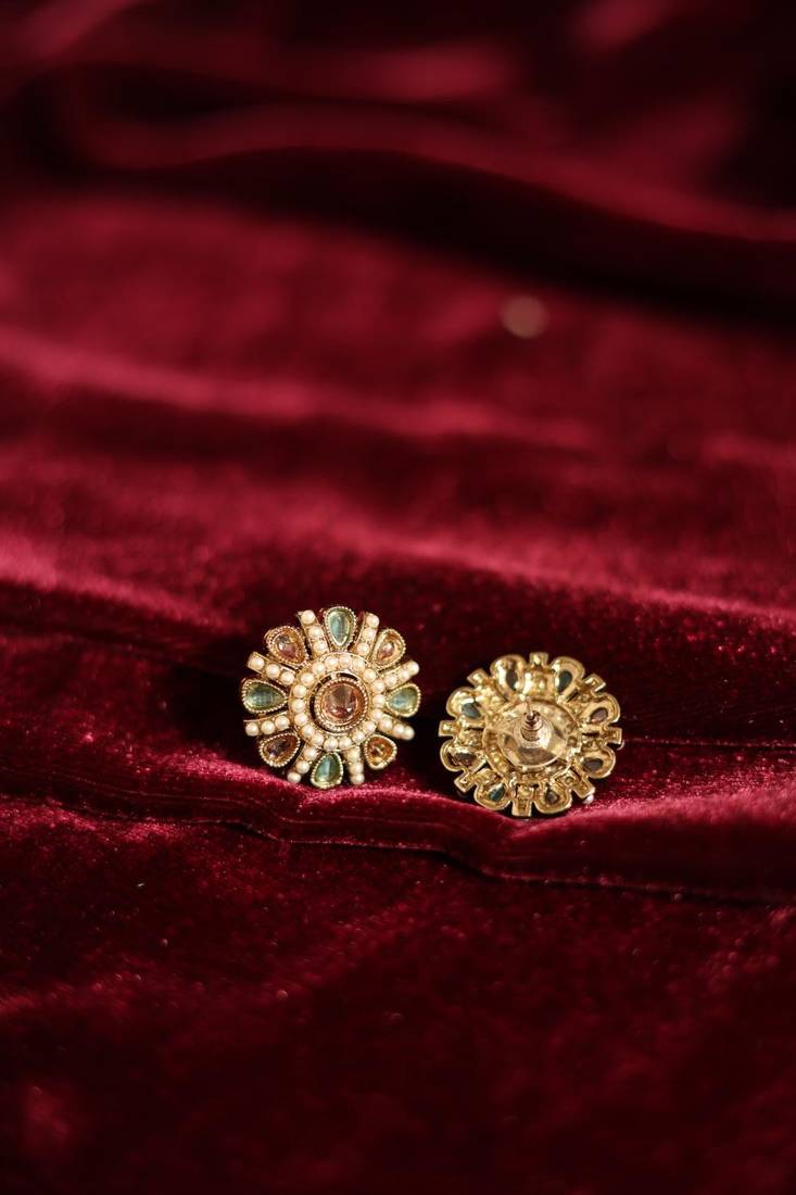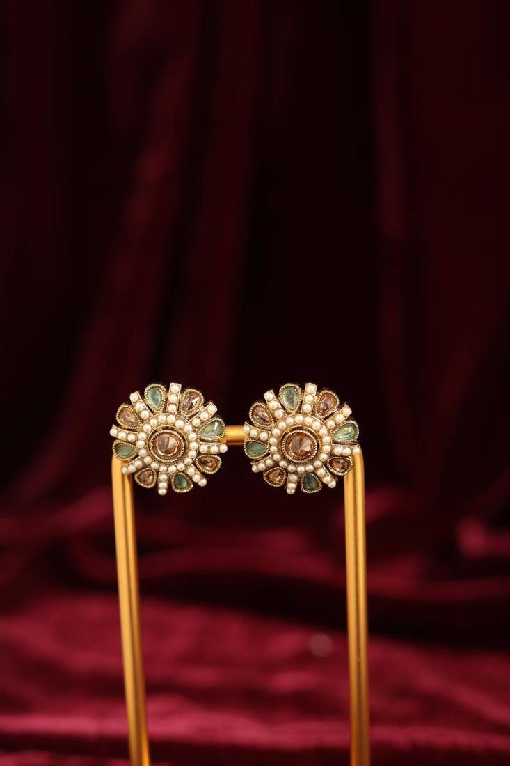 | Product Description | Inspired By Floral Elegance, These Statement Stud Earrings Feature Sparkling Stones, Soft Pearl Accents, And Subtle Green Gemstone Highlights. The Intricate Antique Gold Tone Design Adds Vintage Charm. Perfect For Festive Gatherings, Weddings, Or Cultural Events, These Earrings Bring Graceful Beauty And A Refined Touch To Sarees, Dresses, Or Ethnic Ensembles. |