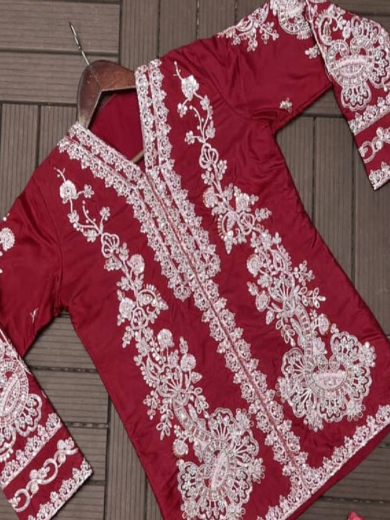 | Product Description | Make A Bold Entrance In This Maroon Embroidered Jacket Set Paired With A Stylish Draped Skirt. Crafted From Premium Satin Blend Fabric, It Features Intricate White Thread Embroidery, A Tailored Long Jacket, And A Fluid Pre Draped Skirt Silhouette. Perfect For Weddings, Receptions, Festive Parties, And Formal Ethnic Celebrations. |