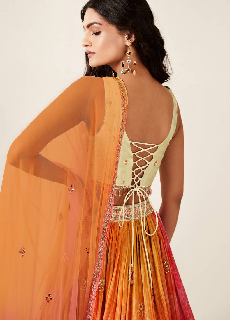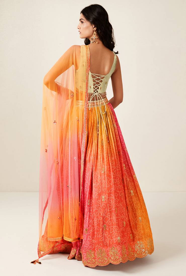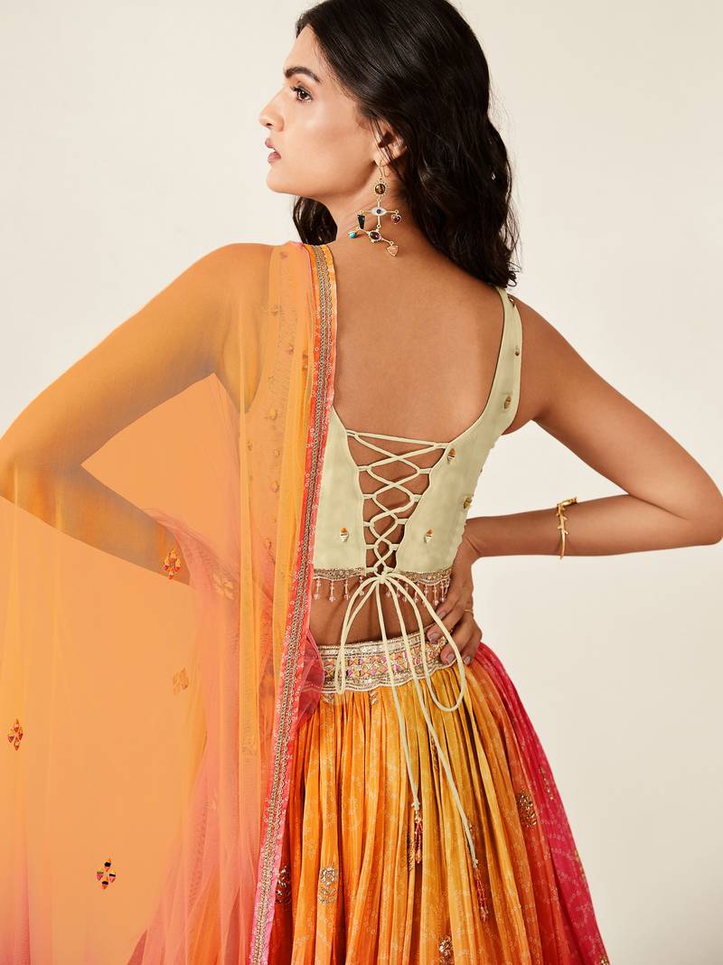 Orange pink bandhani print sequince embroidery organza lehenga choli with dupatta