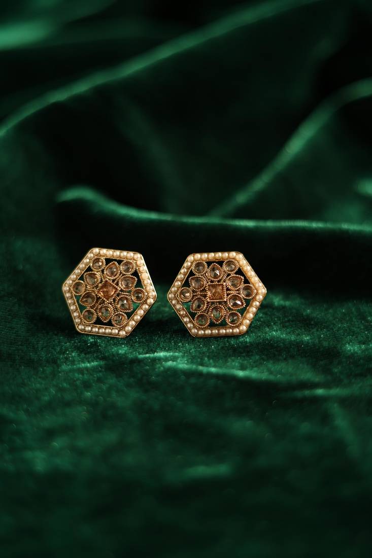 | Product Description | These Sophisticated Hexagon Stud Earrings Showcase A Beautiful Blend Of Crystal Stones And Delicate Pearl Borders. Crafted With Antique Gold Tone Detailing, They Create A Refined Ethnic Statement. Perfect For Everyday Elegance Or Festive Styling, These Lightweight Studs Pair Effortlessly With Both Traditional Outfits And Modern Attire For A Graceful, Timeless Look. |