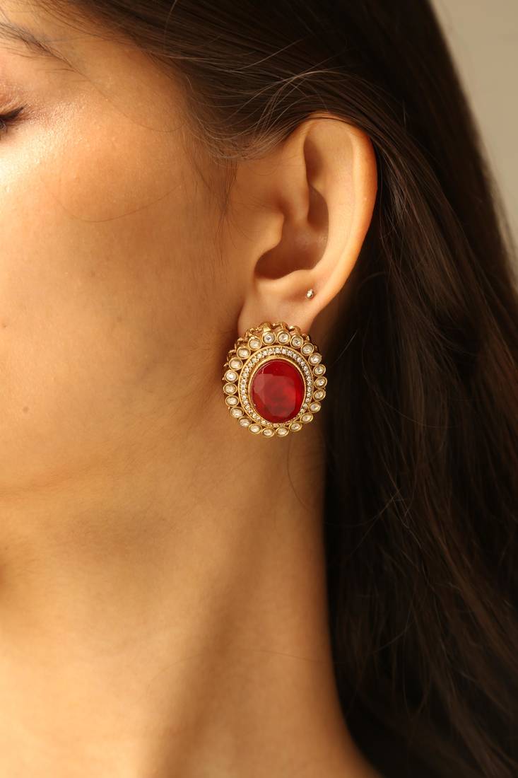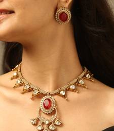| Product Description | A Stunning Traditional Necklace Set Featuring Elegant Triangular Crystal Motifs And A Bold Ruby Red Centerpiece Pendant. The Intricate Gold Tone Detailing And Matching Oval Stud Earrings Create A Luxurious Look. Perfect For Weddings, Festive Occasions, And Bridal Styling. |