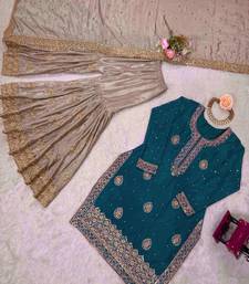 Stylish Teal Kurta Paired With A Beige Sharara And Matching Dupatta Featuring Intricate Embroidery. This Elegant Ethnic Outfit Blends Modern Sophistication With Traditional Craftsmanship. Perfect For Festive Occasions, Evening Celebrations, And Wedding Events. Premium Fabric And Detailed Patterns Offer Comfort While Delivering A Refined And Fashionable Look.