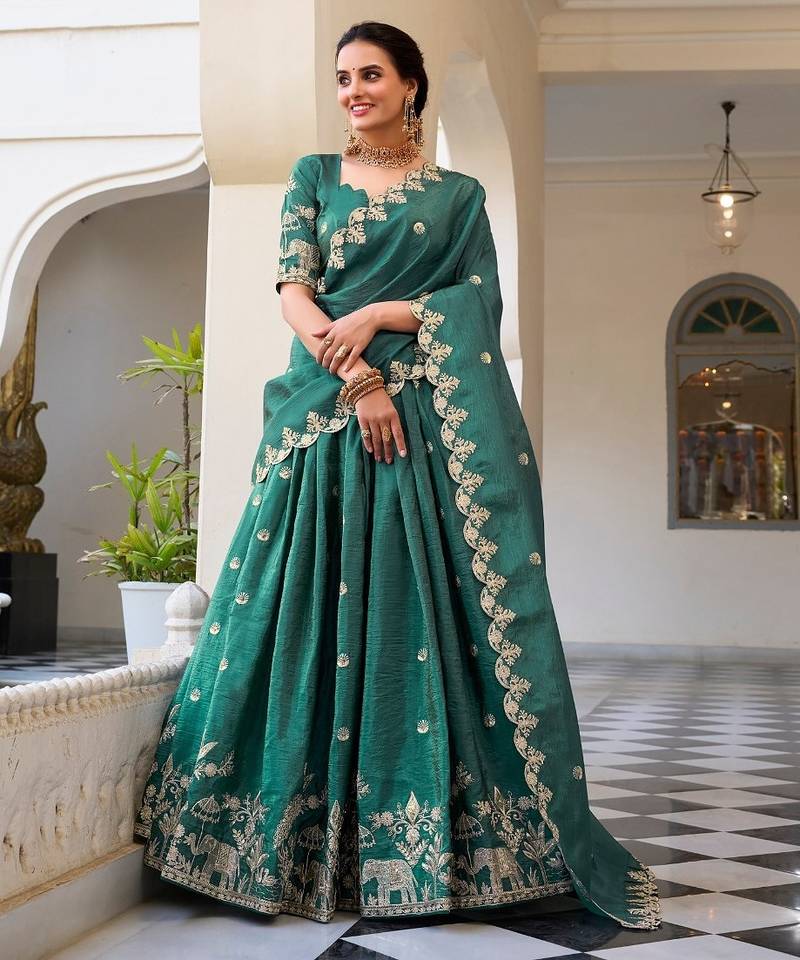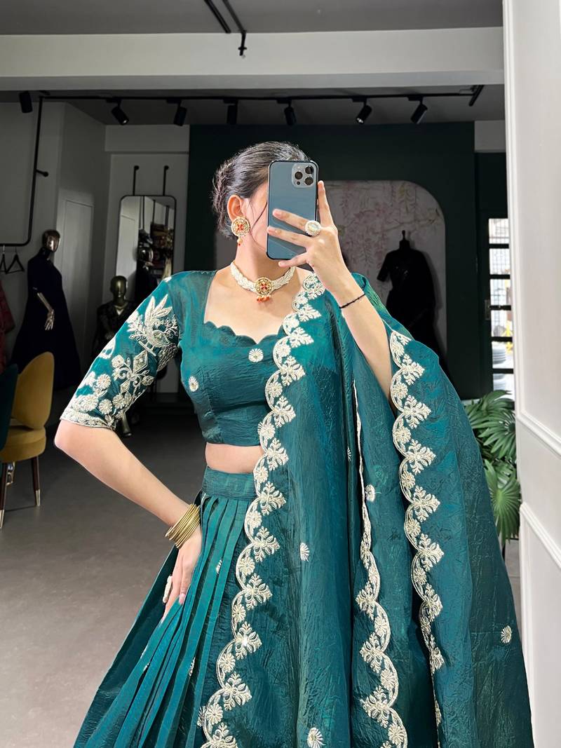 | Product Description | Sophisticated Teal Green Lehenga Featuring Delicate Embroidery Throughout The Skirt And Dupatta Border. The Fitted Blouse Complements The Voluminous Skirt For A Flattering Silhouette. Ideal For Weddings, Festive Gatherings, And Cultural Occasions, This Ensemble Showcases Rich Color And Timeless Ethnic Craftsmanship. |