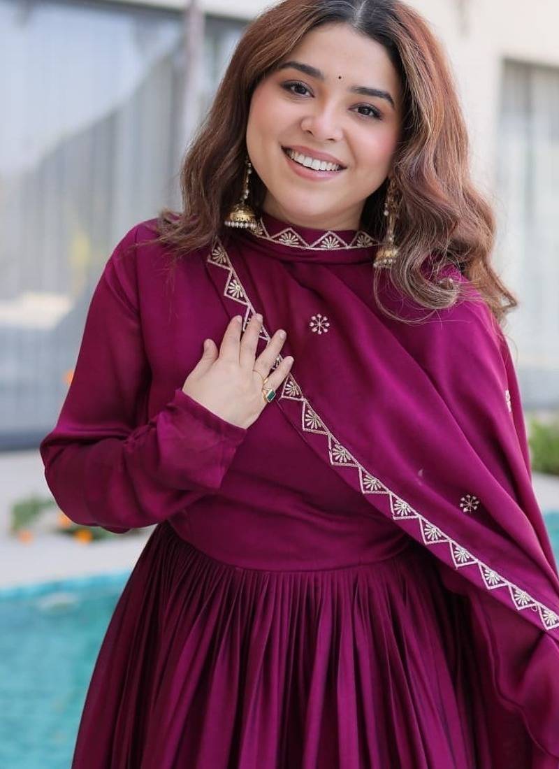 | Product Description | This Wine Anarkali Suit Is Designed With A Flattering Silhouette And Elegant Embroidery Details That Highlight Its Festive Charm. Paired With A Matching Dupatta, The Outfit Offers A Rich And Sophisticated Look. Perfect For Weddings, Festive Occasions, And Cultural Celebrations, It Delivers A Classic And Graceful Ethnic Style. |